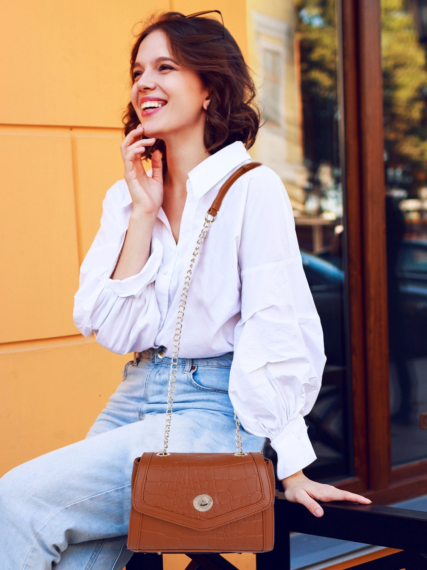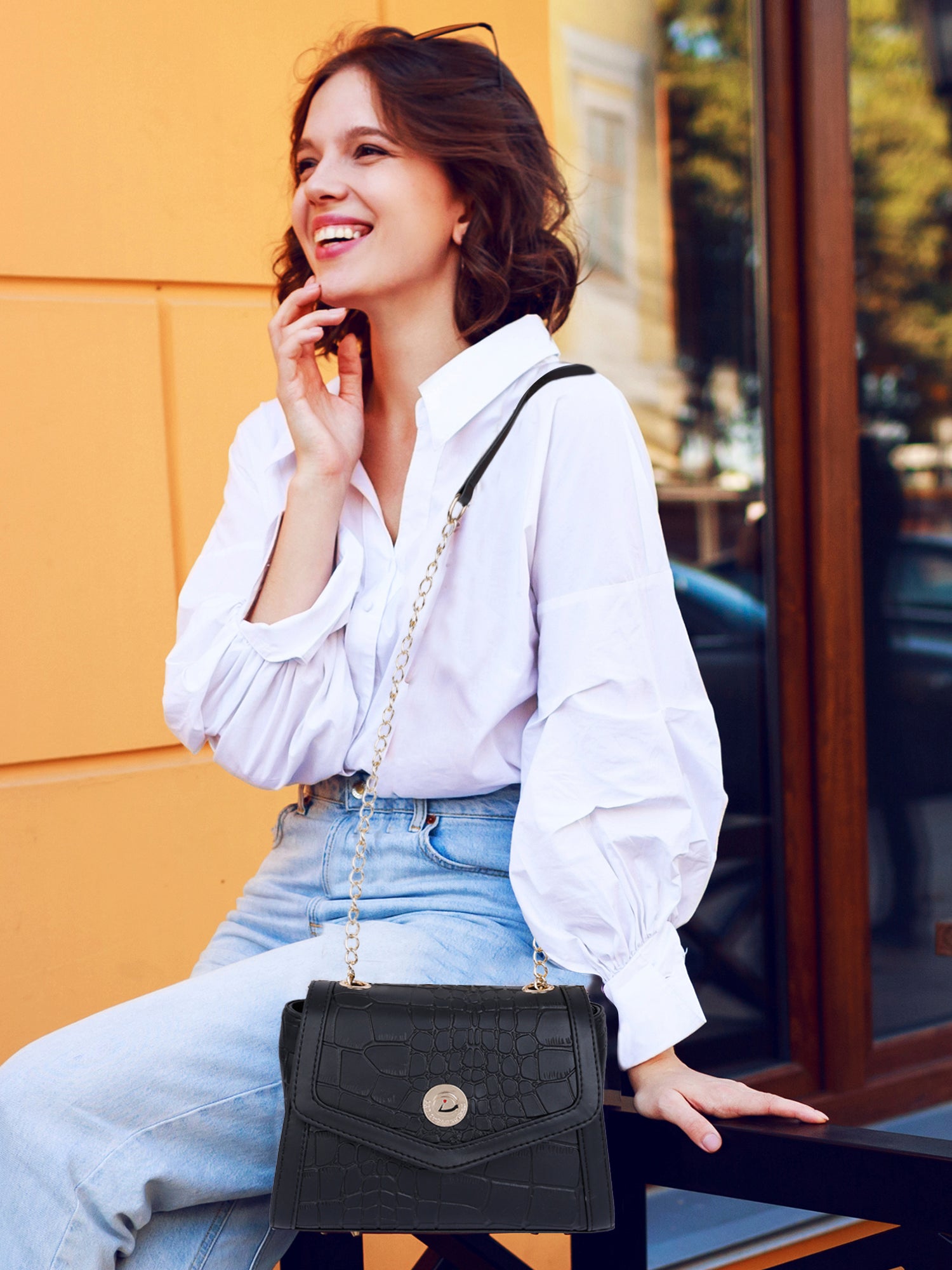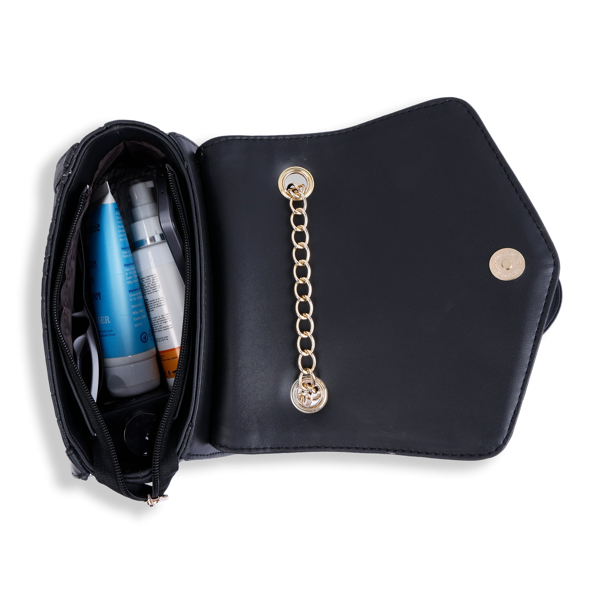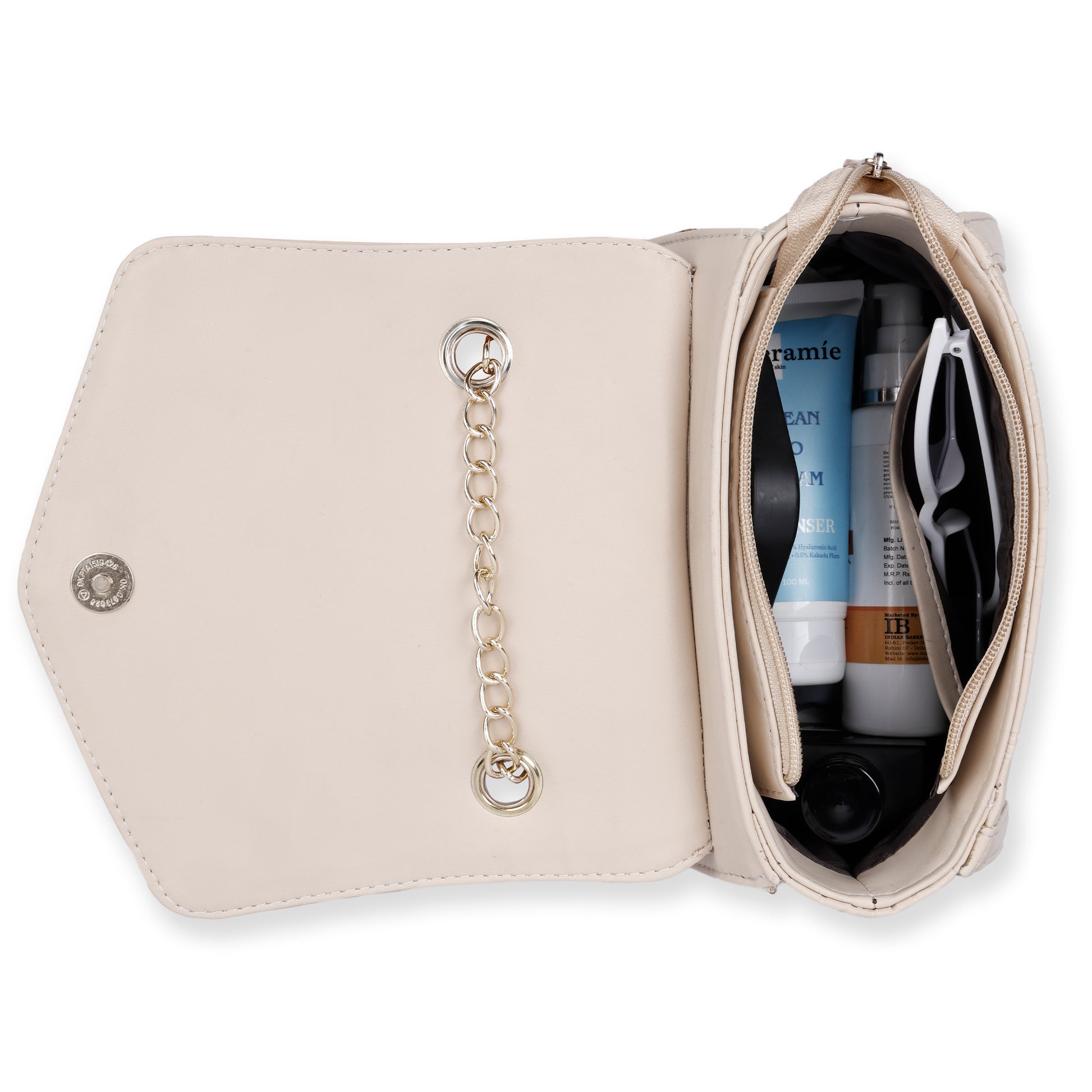 - Gold-Tone Chain Sling Strap for added glamour and easy carry