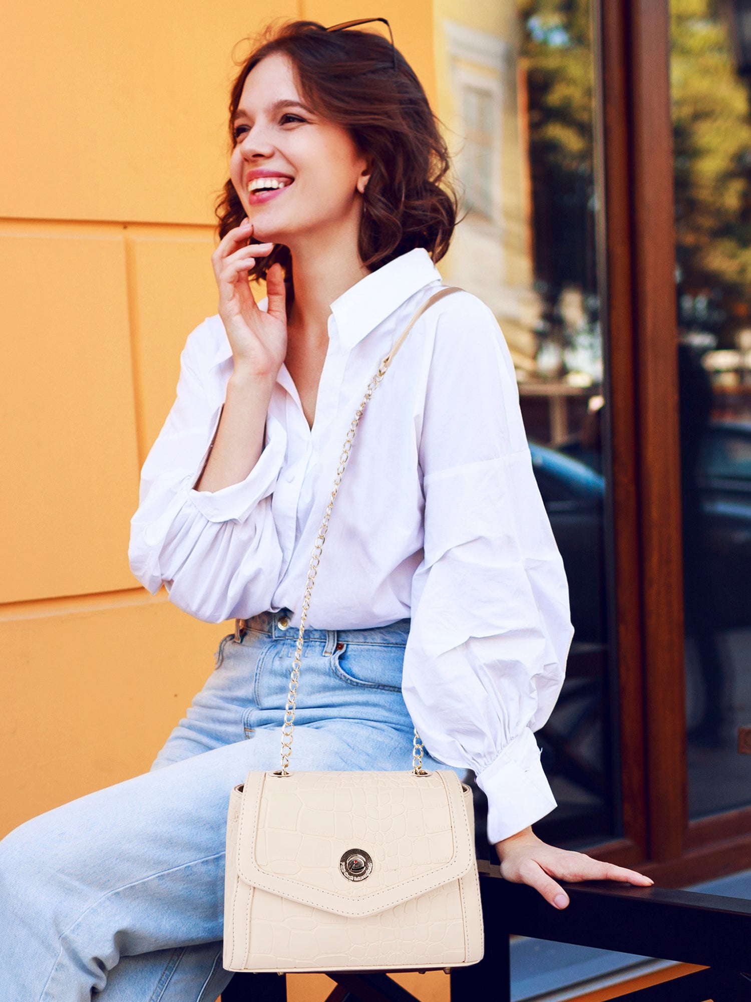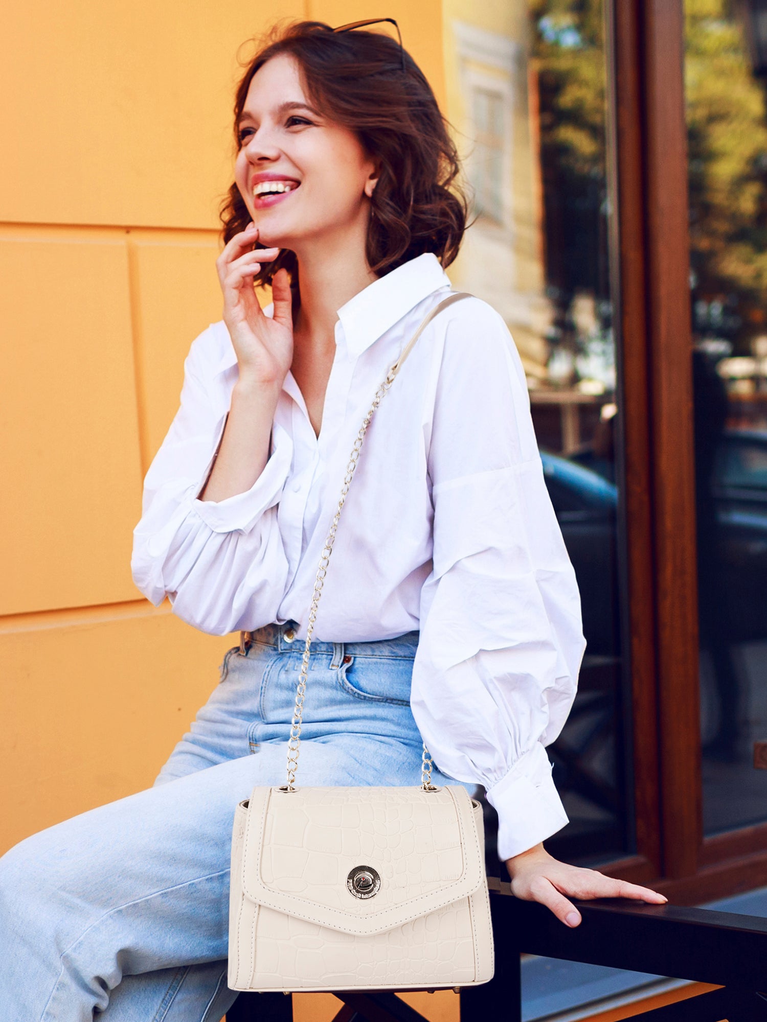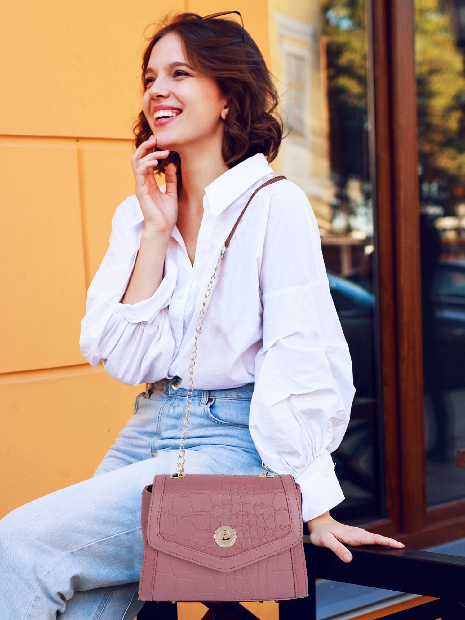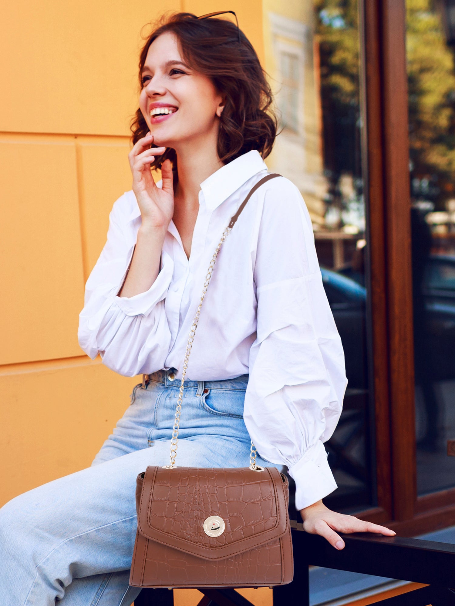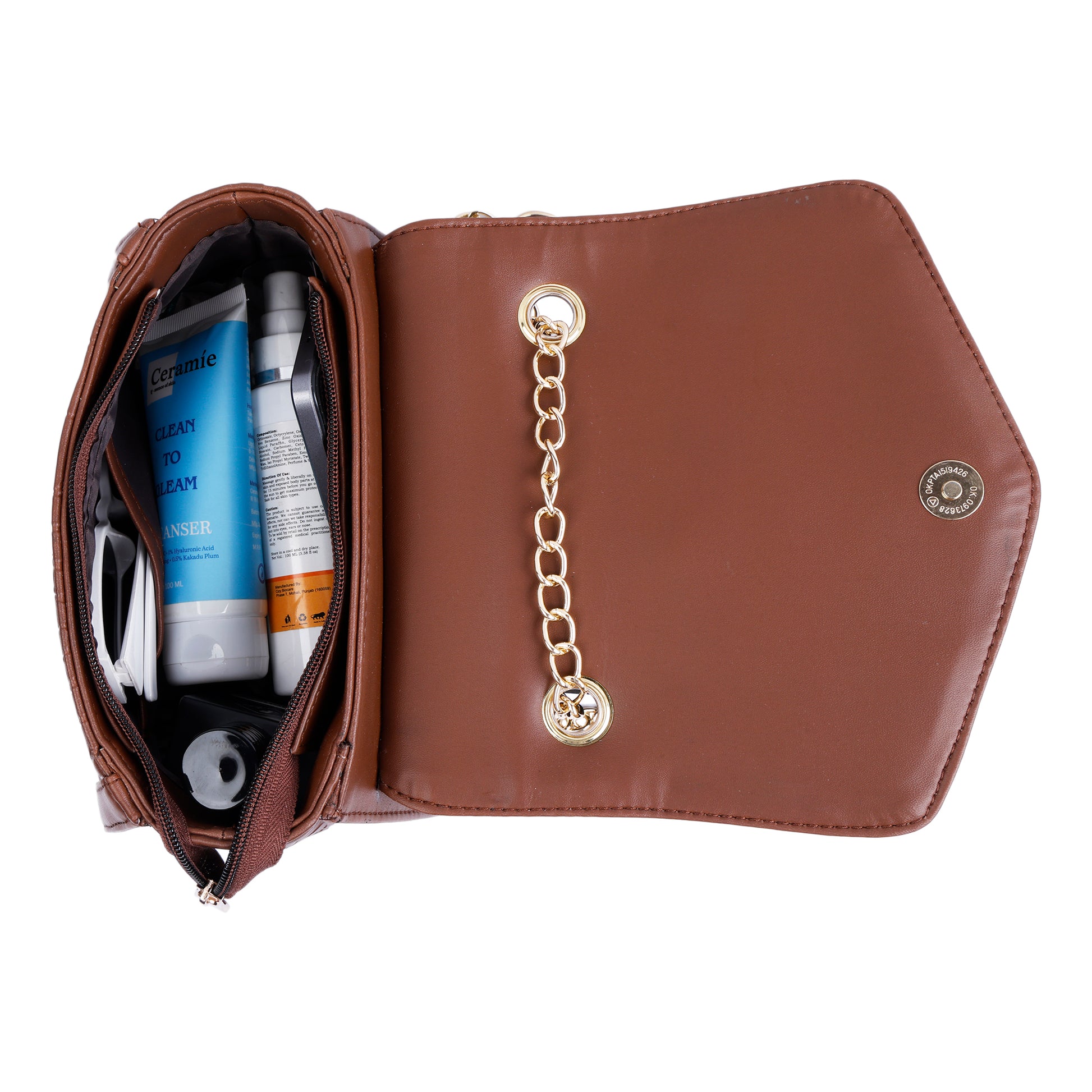- Gold-Tone Chain Sling Strap for added glamour and easy carry